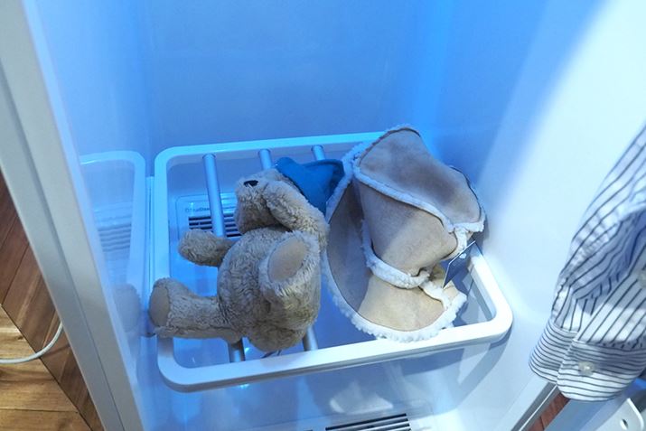 扉を開くと、庫内上部と庫内奥の庫内灯が点灯。庫内奥からは青い光が投射されるが、紫外線除菌などの機能は特にないそう。庫内には3本のハンガー、扉部に1本ズボンかけがあり、合計4枚の衣類を同時にケアできる