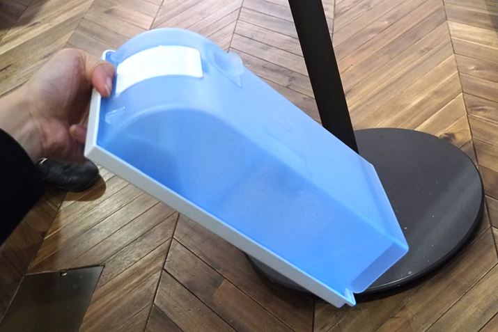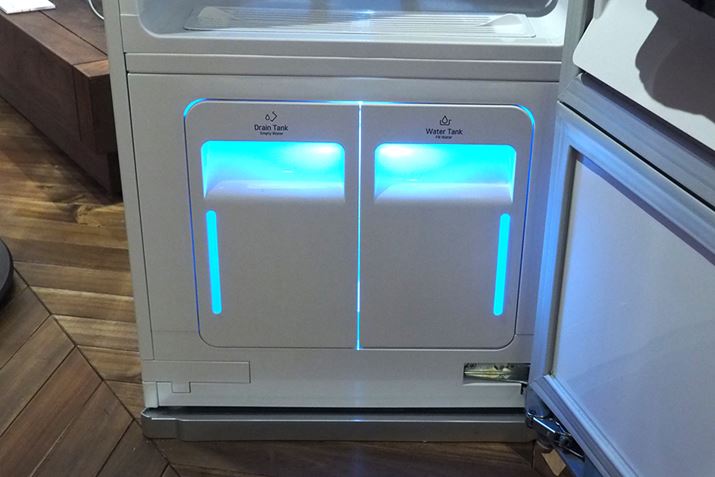 LG Stylerはスチームと振動で衣類をクリーニングするため、使用前には水の補給が必要となる。水タンクは、本体下部左右に2個用意されている。向かって右がスチームに使用する給水タンク。そして、左がスチームで汚れた蒸気を回収する排水タンクだ。必要となる水の量は設定モードによって異なるが、給水タンクは満水時で約4回の使用が可能。ただし、排水タンクは約3回で満水になるという。