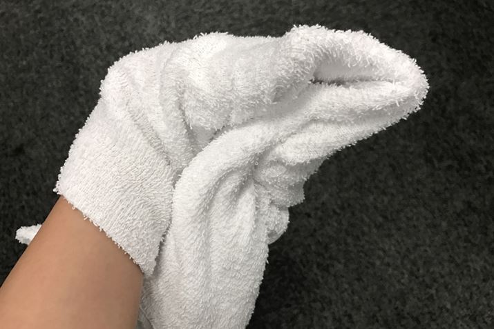 このようにタオルを手に巻きつけて使うと、広い部分は手の全体で、細かい部分は指先で、という風に、手をうまく使ってキレイに拭き取れます