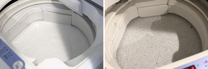 「ワイドハイター」は、投入後すぐに発泡。30分ほどして泡が落ち着くと、洗濯槽からはがれた汚れが見えてきます。なんとも気持ちいい!