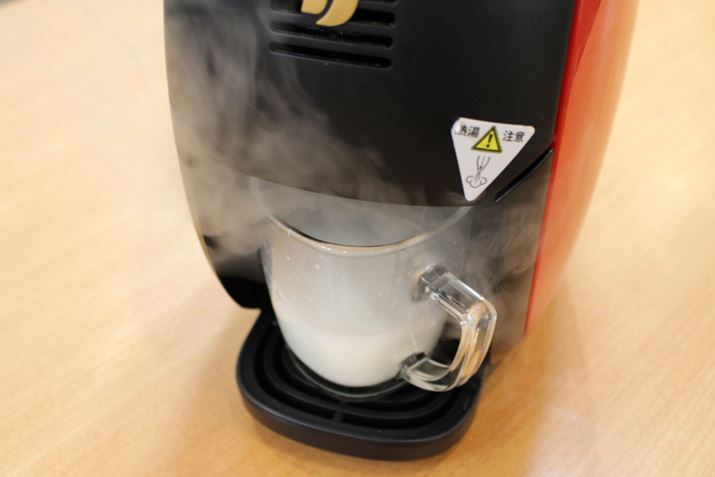 冷たい牛乳を使用してカプチーノを入れている様子。まず、抽出口の隣の「ジェットノズル」から噴出する熱いお湯で牛乳が温められ、泡立つ。この工程、最初はちょっとびっくりした