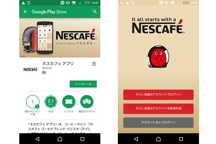 インストールした「ネスカフェ アプリ」を起動すると、「ネスレ会員のアカウントでログイン」、「ネスレ会員のアカウントを新規作成」、「アカウントなしでログイン」の3つの選択肢が表示される。ネスレ会員のアカウントでログインするとコーヒーを飲むたびにポイントがもらえるので、この時点でアカウントを作成しておくのがよさそう