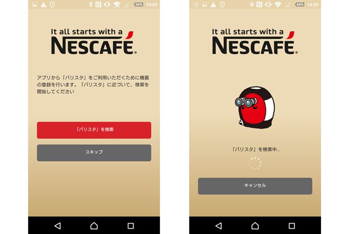 ログインが完了すると「バリスタ アイ」本体の機器登録に移行するので、スマートフォンを持って本体の2m以内に近づき、「バリスタを検索」をタップ。疲れているのだろうか、望遠鏡を使って「バリスタ アイ」を探すキャラクターの姿に思いのほか癒された(笑)