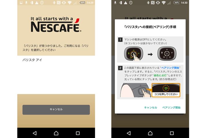 検索結果に「バリスタ アイ」と出たら、これを選択。表示されるペアリング手順を確認のうえ、画面右下のペアリング開始ボタンをタップし、点灯する本体のエスプレッソタイプボタンを押せばペアリングが完了する。いたって簡単だ
