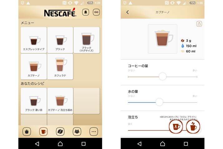 コーヒーの量・水の量・泡立ちをスライドバーで調整して、自分好みのオリジナルコーヒーを楽しむことができる。「バリスタ アイ」本体でも湯量などは調整可能だが、アプリのほうが簡単かつ詳細にカスタマイズできるうえ、好みの配分をマイレシピとして登録することも可能となっている。
