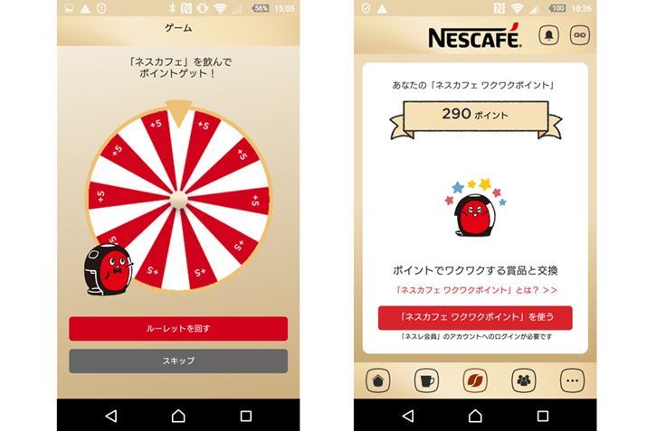 アプリを使ってコーヒーを淹れるだけで「ネスカフェ ワクワクポイント」が20ポイント(マシンを所有するオーナーの場合。そのほかの場合は10ポイント)貯まり、抽出時のルーレットで当たりが出ると、さらに5ポイント獲得できる。貯まったポイントはさまざまな商品と交換することができるという。