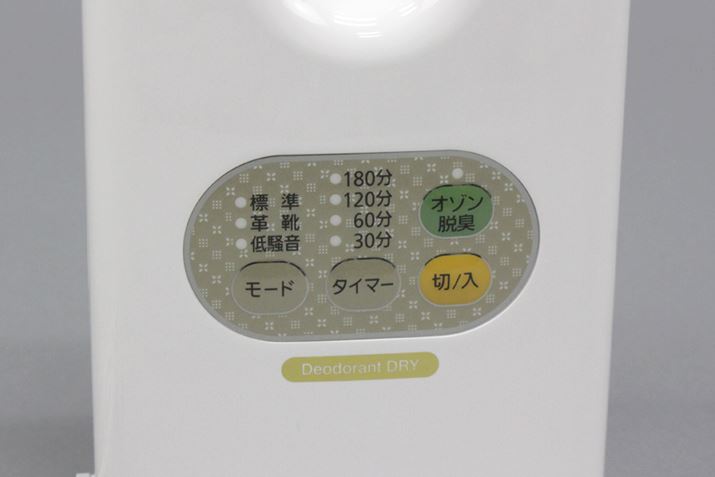 本体前面には、見やすくて操作方法もわかりやすい操作ボタンが。稼動モードは「標準」「革靴」「低騒音」の3種類で、さらに4設定のタイマー機能も付いていることがわかります