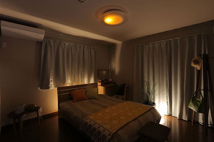 就寝時は、間接照明などを使用して雰囲気のある落ちついた明かりに(写真上)。スケジュール機能を使用して、朝になったら、脳が活性化しやすいという青みがかった明るい光に調整するという使い方もできる(写真下)
