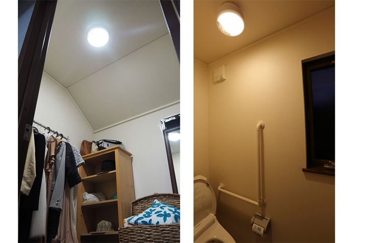 写真左は、クローゼットにセットされた2畳タイプのナノイー発生器付小型シーリング。服についたニオイなどを消臭してくれるという。写真右は、トイレへの設置を想定されている1畳用。トイレではジッとしている時間が多いため、1畳用の人感センサーは感度が非常に高く設定されている