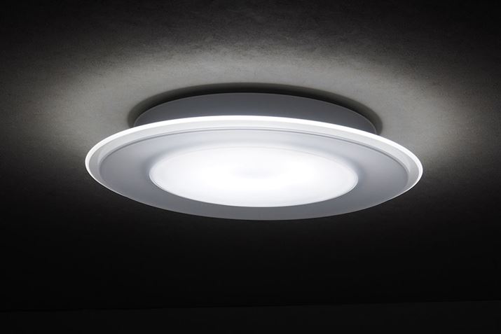 今回、LINK STYLE LEDとして発表されたLED照明は4製品あり、いずれも2017年2月17日に発売予定だ。まず、リビングや寝室などの天井に設置する「LEDシーリング」から2種類のデザインが登場している。ひとつは一般的な丸形をしたシンプルな「HH-XCB1240A(〜12畳用)/HH-XCB0840A(〜8畳用)」。そしてもうひとつが、パナソニックの特徴でもある「導光パネル」を採用した「HH-XCB1283A(〜12畳用)/HH-XCB0883A(〜8畳用)」だ。導光パネルとは、照明本体を取り囲むように配置された円形板状のパネルで、センターのひかりを面状に伝えて拡散させることができるのが特徴。今回のイベントでは、シーリングライトとして、主にこの導光パネルタイプが使用されていた。