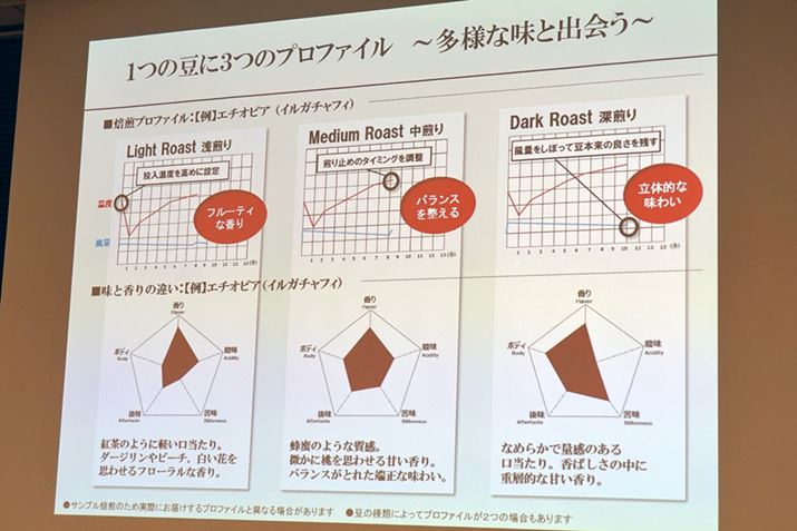 生豆をどの程度煎るかによって、同じ豆でも味わいや香りが変わってきます。焙煎には浅煎り、ライトロースト、ミディアム、ミディアムダーク、ダークロースト、深煎りといった焙煎度がありますが、The Roastには生豆にあわせて1豆ごとに2〜3パターンの焙煎プログラムを用意
