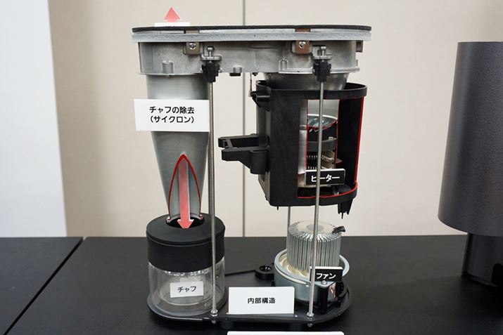 構造を見てみましょう。ヒーターで熱された風で生豆を焙煎するのですが、ファンにより旋風が起こるため、煎ると同時にチャフを取り除くことができ、チャフだけを左側にある容器に分離することができます。チャフはコーヒーの雑味の原因となるため、豆に混じらないことはおいしさにつながる重要なポイント