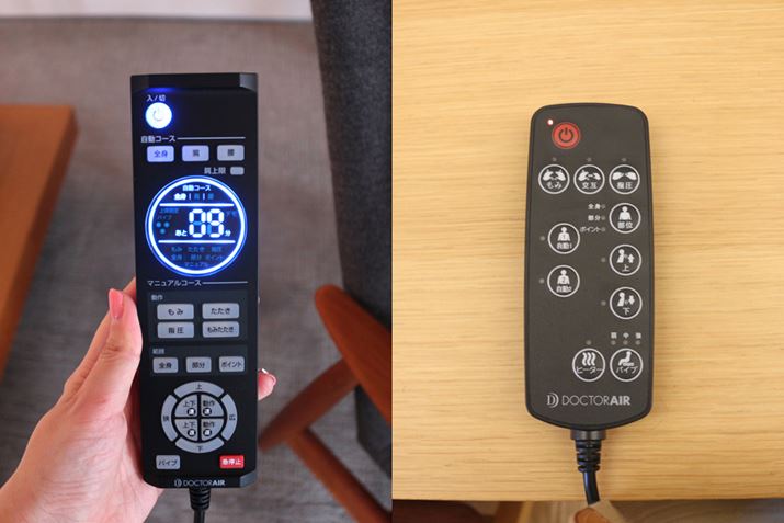 リモコンひとつをとっても、従来モデルのもの(右)に比べて機能が充実したのがわかる。「3D マッサージシート プレミアム」のリモコン(左)は、本格的マッサージチェアのリモコンのようだ