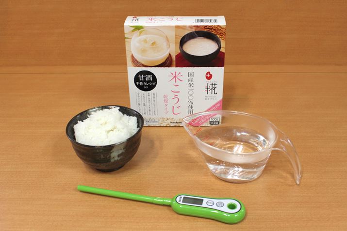 甘酒の材料は、ごはん(おかゆでも可)、お湯(おかゆを使う場合は水)、そして米糀だけとシンプル。今回使用した「プラス糀 国産米使用 米こうじ」(マルコメ)100gの場合、ごはんは200g必要になります。甘酒作りの要は温度管理なので、温度計は必須