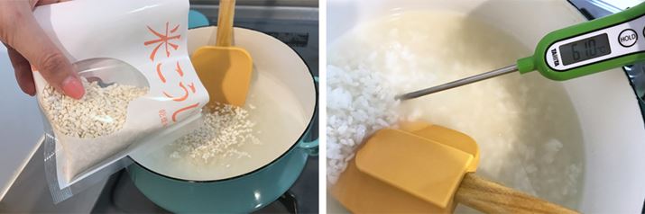 「糀美人」を使用する場合も、材料はごはんとお湯と米糀。ごはんとお湯を混ぜ、60℃くらいの温度になったところで米糀を入れてさらに混ぜるという作業が必要なので、引き続き温度計が必須となります。