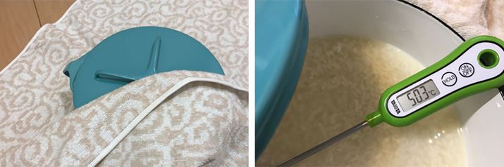 保温の方法は、鍋にふたをして毛布にくるむという原始的な手法をあえて選択。温かければよいというわけではないというところがまたやっかいで、1時間ごとに温度を確認して必要があれば加熱をし、50〜60℃の範囲を保ち続ける必要があります。