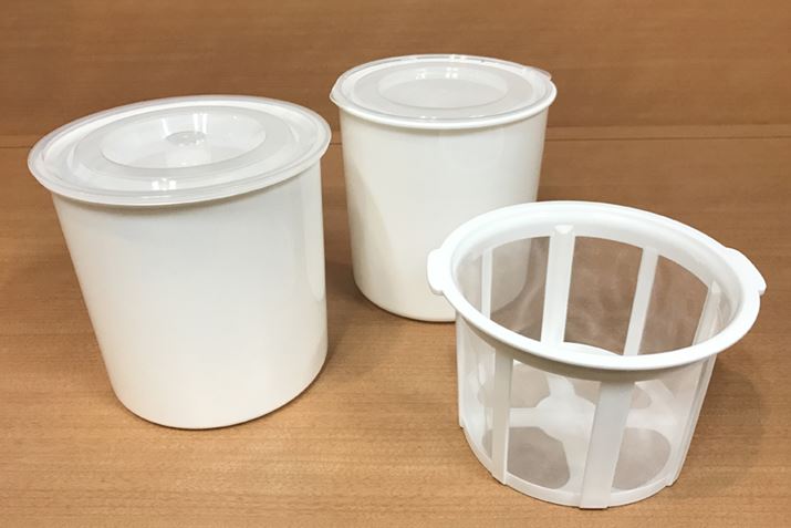 本体のほかに、2サイズの調理容器(1,500 ml、1,300ml)、水切りヨーグルトを作る際に使用する水切りかごが同梱されています