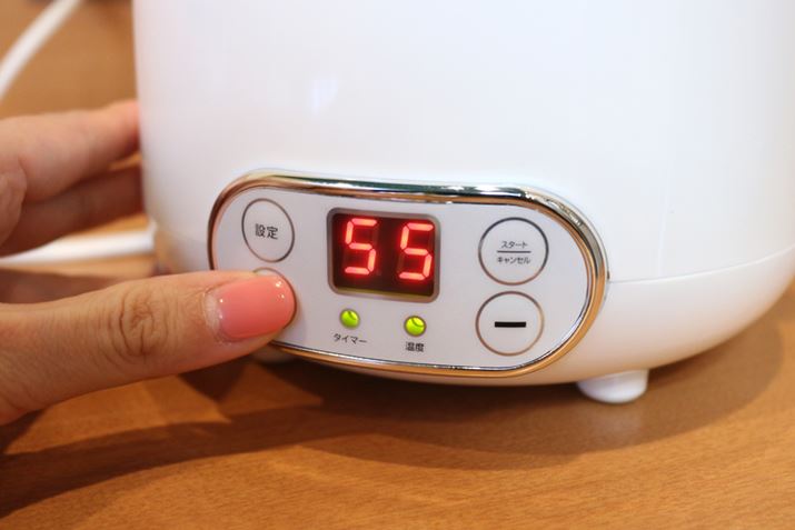 温度は20〜55℃(1℃刻み)、タイマーは1〜48時間(1時間刻み)で設定できます。甘酒の場合は、55℃で8時間セット