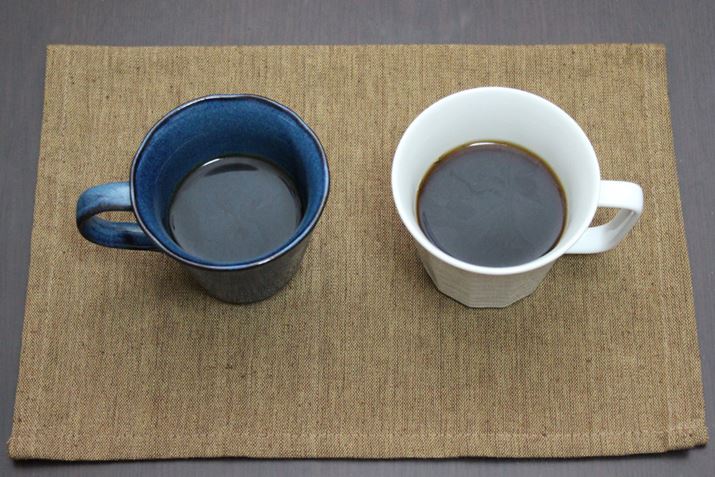 「アロマモード」で淹れたコーヒー(左)と、「通常モード」で淹れたコーヒー(右)。どちらも同じコーヒー粉を使って、ICMI011Jで淹れています。当たり前ですが見た目ではまったく違いがわかりません