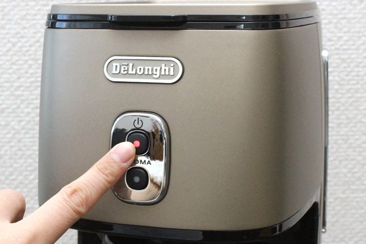 スタンダードに「通常モード」でコーヒーを淹れるときは、本体フロントにある電源ボタンをワンプッシュするだけ。赤いランプが付くと抽出中になります。2杯分の抽出時間は2分半ほど