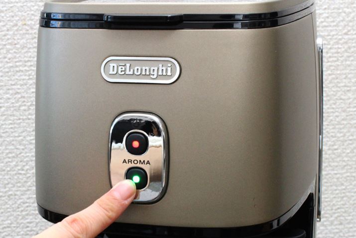 「アロマモード」でコーヒーを淹れるときは、上の電源ボタンをプッシュした後、その下にある「AROMA」ボタンを押せばOK。緑のランプが点灯すると「アロマモード」による「間欠抽出」が始まった証拠です。途中で「アロマモード」を取り消したいときは、もう1回「AROMA」ボタンを押せばキャンセルされます