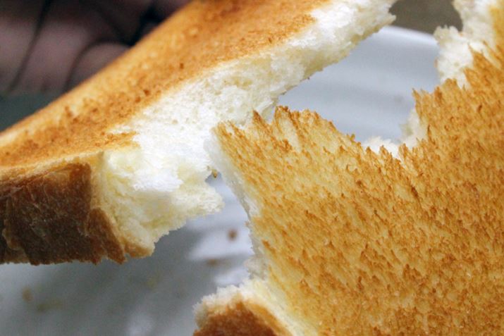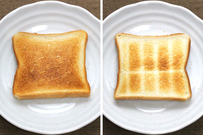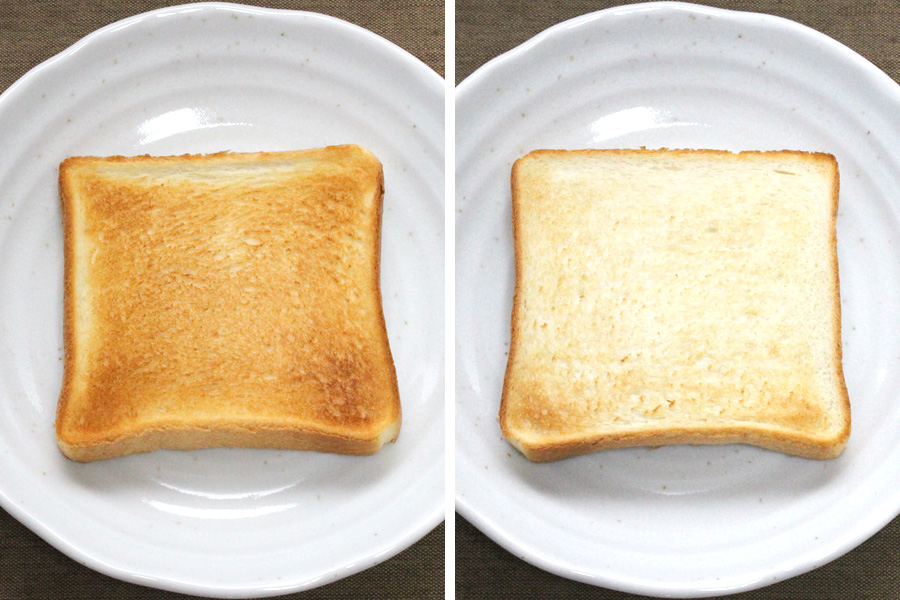 焼き上がったトーストは、表面(左)も裏面(右)もムラなくこんがり焼けています
