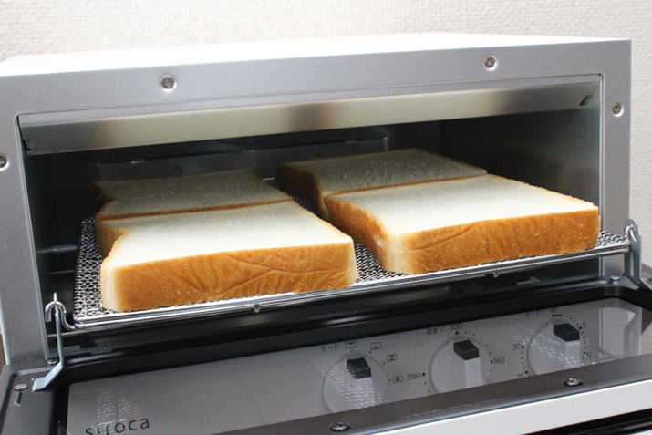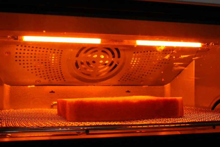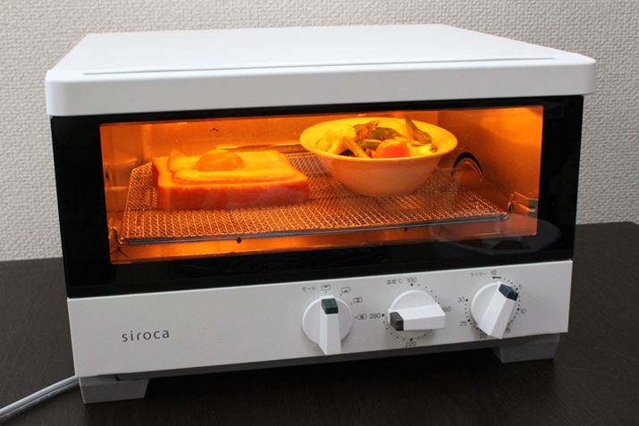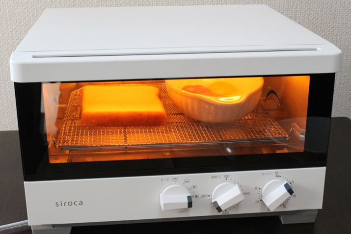 手始めに、普通にトーストを焼いてみました。温度は280℃で、コンベクションモード、2分タイマーでスタートします。アラジンのAET-GS13NWと同じく、0.2秒で一気に立ち上がる様子がスゴい。グラファイトヒーターを使ったトースターの魅力にちょっとハマりそう……
