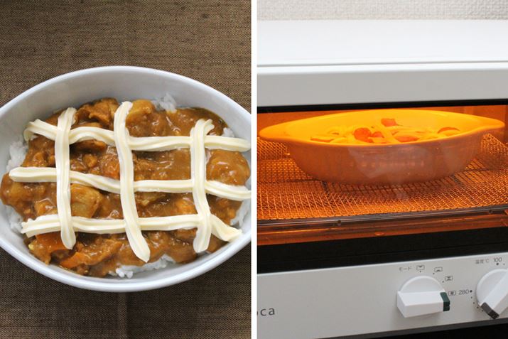 続いてはこちら。突然ですが筆者は朝カレー派でして、前日作ったカレーを耐熱皿によそい、上にマヨネーズをかけてST-G111にINしました。温度を230℃に設定し、上下ヒーターモードで10分加熱してみます