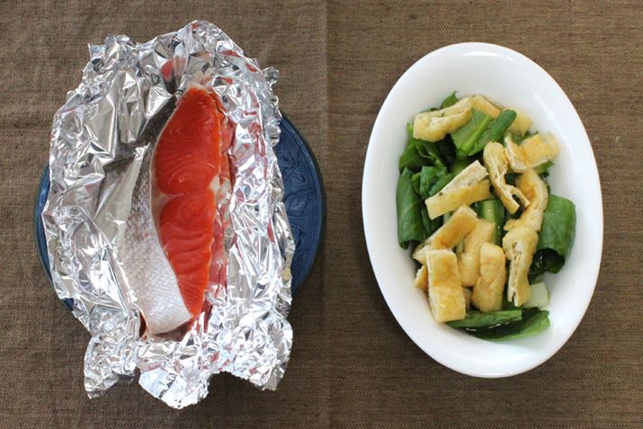 近所のスーパーで安売りしていた鮭の切り身を、アルミホイルに乗せてセット。小松菜と細切りの油揚げに、水・しょう油・みりん・酒をふりかけたものを用意しました