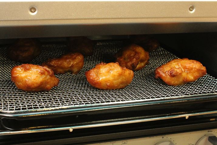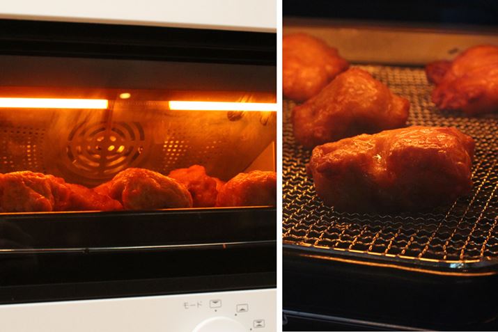 トレーとトレー用焼き網を使って、油を使わないノンフライ調理もOK! から揚げもコンベクションモードを使ってたった16分ででき上がります