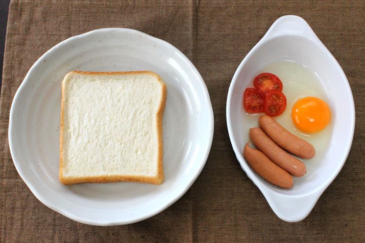 トーストと目玉焼きウインナーを同時調理してみましょう。耐熱皿にウインナーを置いて、生卵を割り入れれば準備OKです。今回は少々おしゃれに、切ったミニトマトも添えてみました