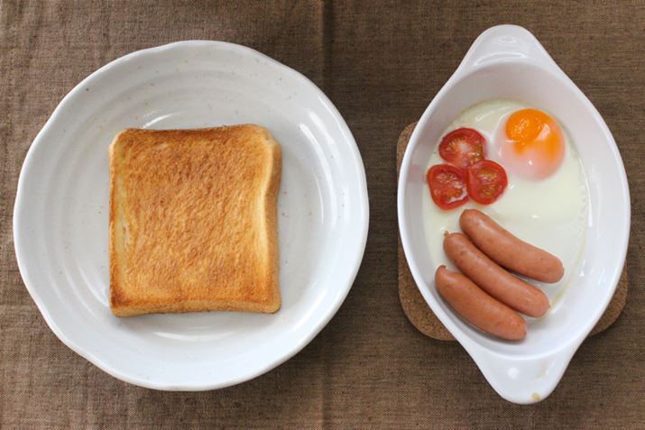 まずはトーストと目玉焼きウインナーを同時に作ってみましょう。……といっても、食パンとおかずを一緒にST-G111の中に入れたら、あとはつまみを回してほったらかしておくだけ。5分後には、おいしい朝ごはんができあがっています。フライパンやお鍋を汚すこともありません。