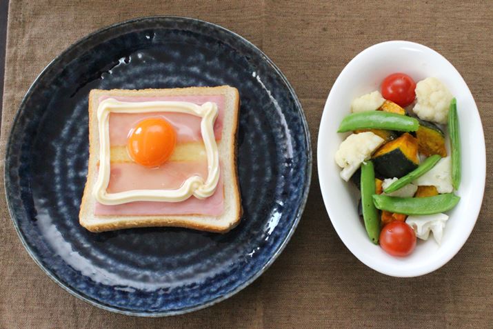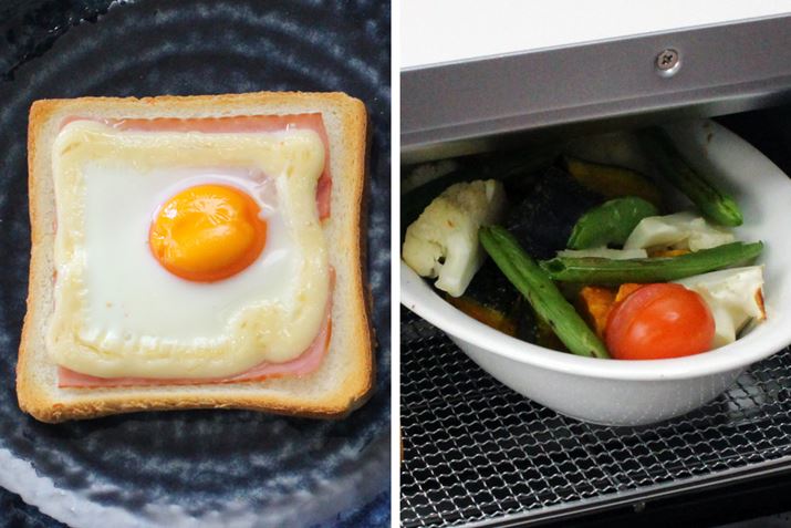 ベーコンエッグトーストとグリル野菜を同時調理してみましょう。前日夜のうちに野菜を切って電子レンジにかけ、耐熱皿のまま保存しておくと非常に楽。朝になったら、それを食パンと一緒にST-G111に入れれば、5分後にはもう朝食ができあがっちゃうんです。筆者は野菜にオリーブオイルと塩だけをかけて焼いてみました