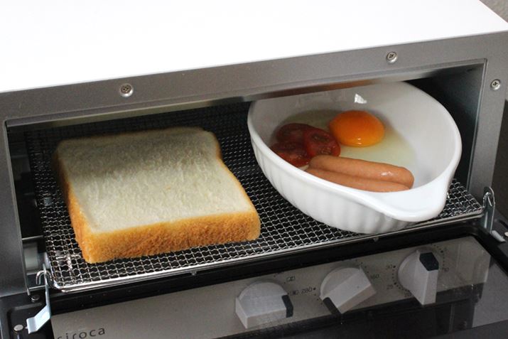 焼き網の左側に食パン、右側におかずを入れたお皿を置いて、コンベクションモード、温度は230℃、5分タイマーをスタート。ものの5分でトーストと目玉焼きウインナーが同時に完成しました。朝から目玉焼きを焼くのは、正直面倒くさいですが、ST-G111ならフライパンを汚すこともなく超簡単にできちゃいます!