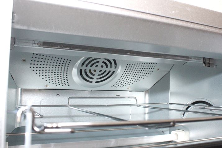 庫内を見てみると、上面に1本のグラファイトヒーター、下面に2本の石英管ヒーターを備え、奥にコンベクションのファンがあるのがわかります