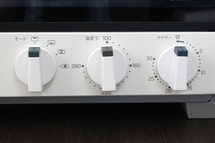操作用のつまみまでデザイン性が高い! それぞれ「温度設定」「タイマー」「稼動方式」を調整できます。一番左にあるのが稼動方式を選択するつまみで、「上面ヒーター」「下面ヒーター」「上下ヒーター」「コンベクション」の4種類から選択可能。トーストを焼くときは基本的に「コンベクション」にしておけば、熱風循環させてパンをムラなく焼き上げてくれます