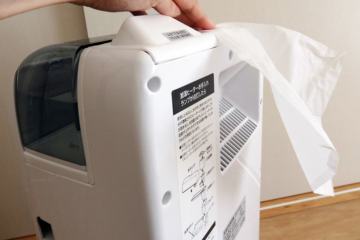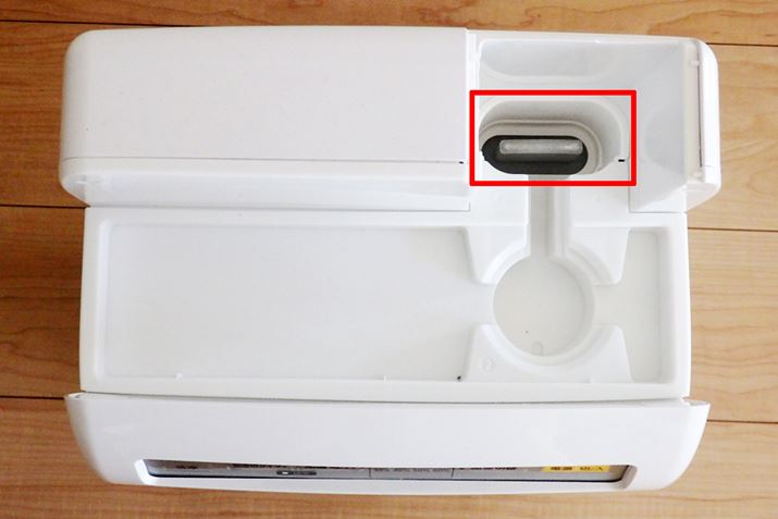 加湿の機構は、本体上部にまとめられています。水タンクの容量は約2Lで、連続加湿時間は約7時間。天面にある吹出口は加湿時に蒸気を出すためのものです
