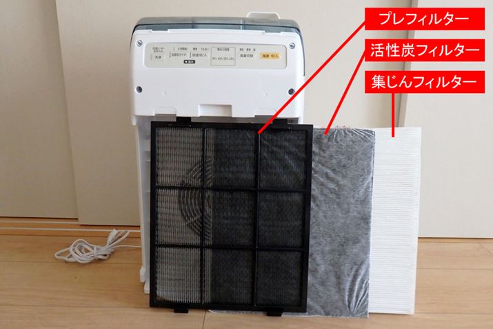 空気清浄のための機構は一般的な空気清浄機と同じで、本体内に数枚のフィルターを内蔵。プレフィルターと集じんフィルターで汚れをキャッチし、活性炭フィルターでニオイを除去します。集じんフィルターには、0.3μmの 粒子も99.97%以上捕集するHEPAフィルターを採用