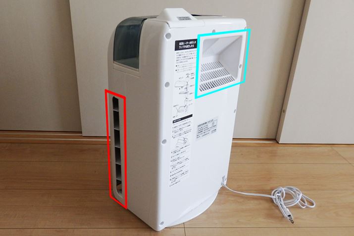 室内の空気の吸い込みは本体側面から行い(赤色の囲み部分)、フィルターでろ過したキレイな空気を背面の吹出口(水色の囲み部分)から放出します