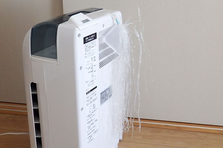 「標準」の風量は1.2u/分で、細く切って束ねたビニールは数本がなびく程度でした。運転音は生活音にかき消されてしまうほど小さいため(33dB)、普通に過ごしている分には気になることはないでしょう