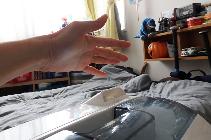 さっそく、加湿+空気清浄運転の実力を鉄筋コンクリート建てのマンションの部屋(6畳)で検証してみました。なお、HXF-A25には運転を自動制御するセンサー類は搭載されていないため、自動運転モードはありません。風量(静音/標準/強)や加湿の運転(標準/うるおい)の切り替えは、手動で行います。ただし、湿度センサーで室内の湿度は検知しており、加湿運転の「標準」では湿度50%、「うるおい」では湿度60%に達すると加湿運転を停止。湿度が下がると再び加湿運転が始まるようになっているので、高湿になるおそれはありません。