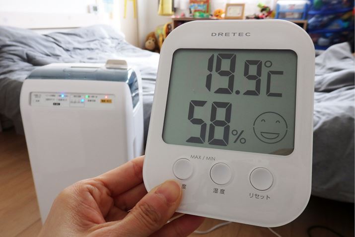 その後、30分足らずで湿度は60%に到達。運転前は41%だったので、かなりスピーディーな加湿ができることを確認できました。部屋の場所によって若干差異はありますが、本体から1mほど離れたところで計測した結果は58%! 湿度ムラの程度から見ても、風量「標準」でも空気の循環具合はよさそうです