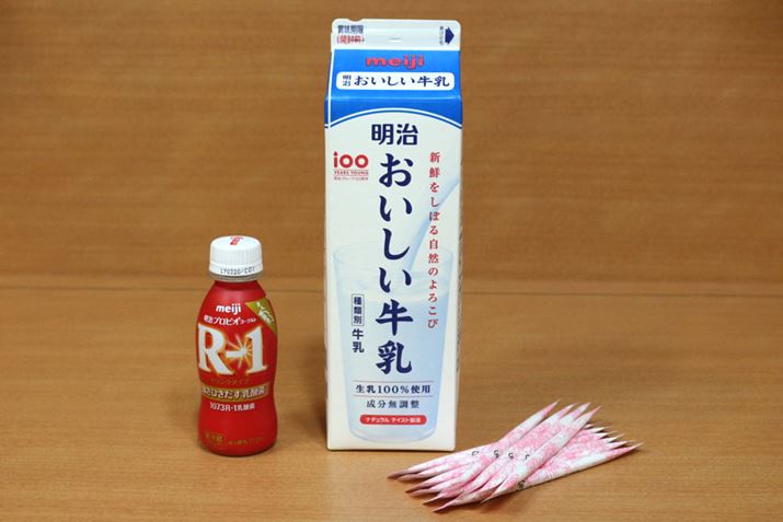 スターターは、牛乳と混ぜやすいドリンクタイプを用意。牛乳は、「無脂乳固形分が9.7%で乳脂肪分が3.05%」のものがよいという情報を得たものの手に入らなかったので、成分無調整のものを使用。砂糖は菌が培養する際の「エサ」の役割となるのだそう