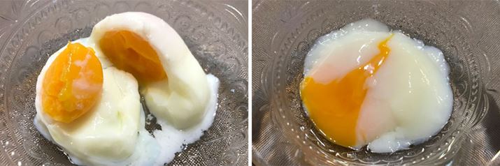 白身が固まりすぎたのは、最初に入れたお湯の温度が高かったため(写真左)。黄身が固まらないのは、冷蔵庫から出してすぐの冷たい卵を使ったため(写真右)