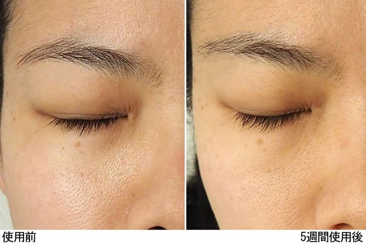 使用前と5週間後の肌。写真では少々わかりにくいのですが、手で触るとツルンと滑らかになりました。また、目の周りの小じわも少し減っています。目と同時に鼻の付け根もケアしていたのですが、この鼻の付け根部分の毛穴が小さくなっているのもわかります
