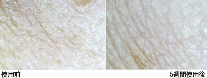 使用前と5週間後の左目横の肌をマイクロスコープで拡大してみました。5週間後もまだまだ理想の三角のキメ……とはいえませんが、肌の皮溝(線のように見える溝)が整い、全体的にふっくらとしている印象です