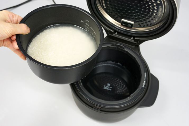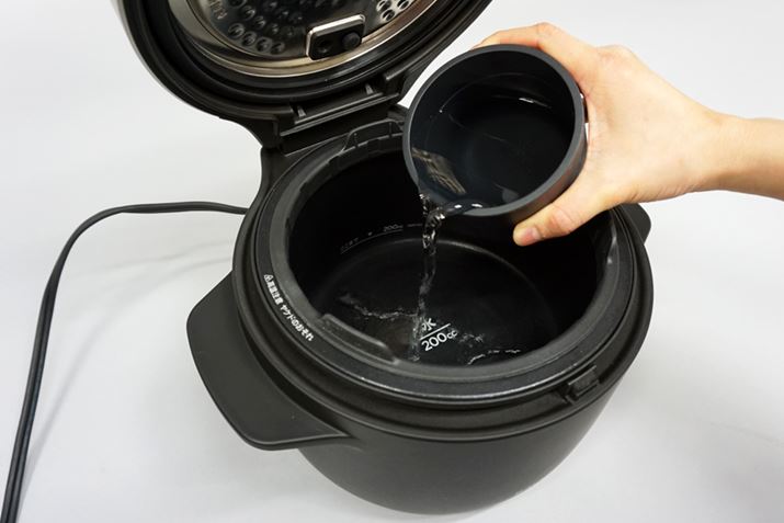 外釜に水を200mL投入。専用カップも付属しますが、外釜の内側に目盛りも記されているので、普段使っている水差しや蛇口から直接注ぐことも可能です