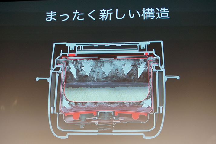 米と水を入れる内釜と、水蒸気にするための水を投入する外釜の2つの釜を使って炊飯します