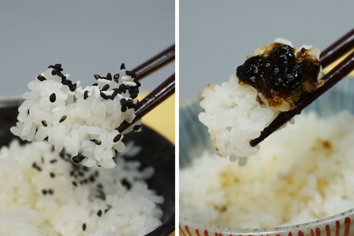 粒々としたごま塩もとろりとしたのり佃煮も、1粒1粒を感じる「BALMUDA The Gohan」のごはんと絶妙な相性。口の中に入れ、喉を通る時の食感が心地よくて食が進みます