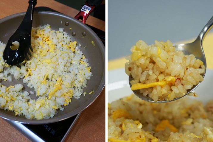 チャーハンはべちゃっとさせたくないので、炊きたてごはんなんてご法度という方も多いでしょう。「BALMUDA The Gohan」は粒感がすごいので炊き上がり直後でもチャーハンに適するのでは? と試してみました。フライパンで炒めている時は若干ダマになりましたが、すぐにほぐれ、炊きたてでこのパラパラ感が出せたのは見事です